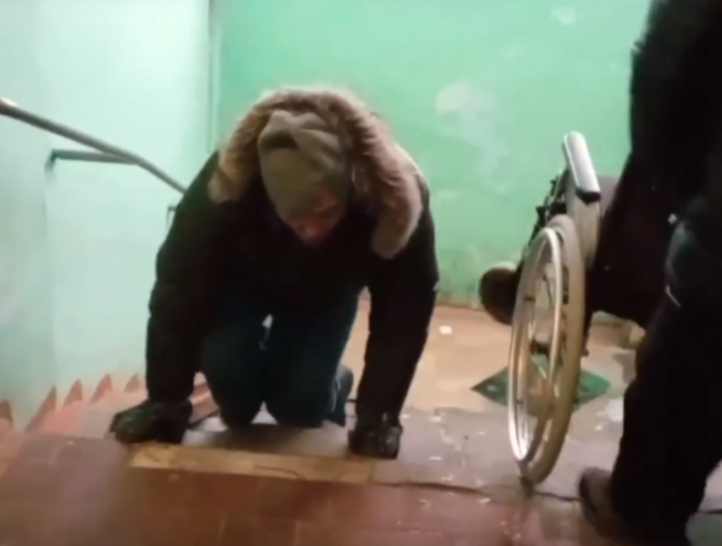 Запись видео, как житель дома в Краснокамске поднимается и спускается по лестнице, будучи инвалидом-колясочником, прислал в региональное отделение Общероссийского народного фронта его отец. Видео появилось в соцсетях организации. Мужчина вынужден каждый раз ползти на одних руках по грязной лестнице. При этом имеющееся приспособление в подъезде оказалось непригодным для использования.